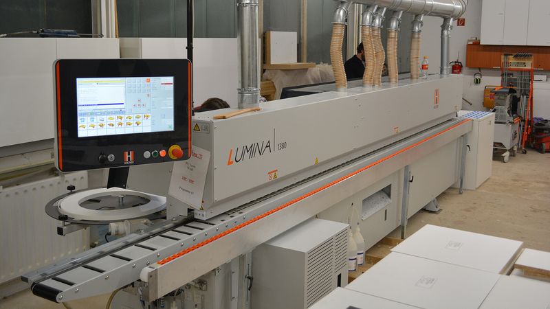 Im Jahr 2016 ersetzte die Schreinerei die bestehende Kantenanleimmaschine SPRINT 1317 durch eine neue und größere LUMINA 1380. Diese Maschine aus dem Hause HOLZ-HER ermöglicht perfekte Nullfugenoptik sowohl mit PUR, als auch mit Laser-Technologie. Bedient wird die Maschine von der Inhaberin Frau Krocker, der Kantenexpertin der Schreinerei.